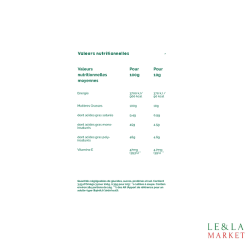 Fruit d’Or est une huile naturellement source d’Oméga 3 et 6 et naturellement riche en vitamine E. Usages : Assaisonnement, cuisson et friture. A conserver à température ambiante, à l’abri de la chaleur et de la lumière.