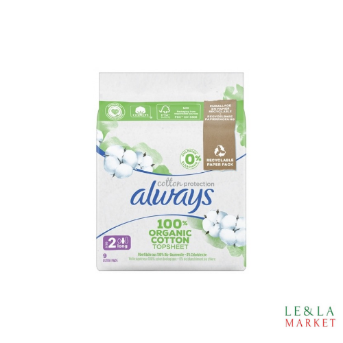 Serviettes Hygiéniques avec ailettes 100% coton Bio long Taille 2 Always x9