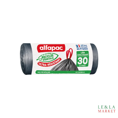 Sac poubelle Alfapac , sont pratique: pré-détachés , avec lien coulissant facile à fermer. Fabriqué en France , recyclée 69% & végétale 20%. Tenir hors portée de l'enfant.