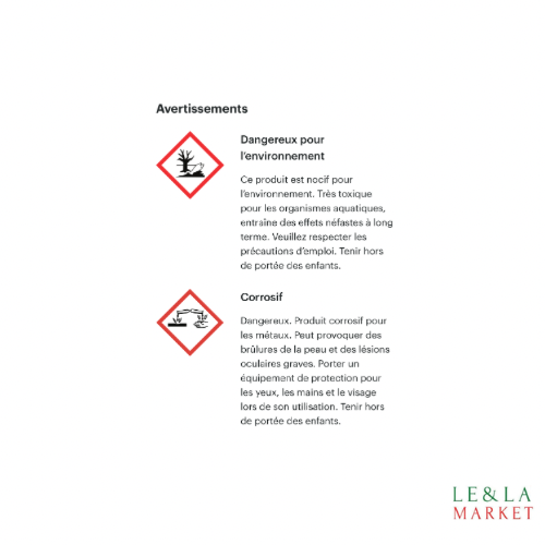 Provoque de graves lésions des yeux. Provoque une irritation cutanée.\nEN CAS DE CONTACT AVEC LES YEUX : rincer avec précaution à l'eau pendant plusieurs minutes. Enlever les lentilles de contact si la victime en porte et si elles peuvent être facilement enlevées. Continuer à rincer. Appeler immédiatement un médecin\n\nEN CAS DE CONTACT AVEC LA PEAU : Laver abondamment à l'eau. En cas de consultation d'un médecin, garder à disposition le récipient ou l'étiquette.\n\nEliminer l'emballage vide selon les prescriptions du règlement municipal d'élimination des déchets. Conserver uniquement dans le récipient d’origine. Attention! Ne pas utiliser en combinaison avec d’autres produits. Peut libérer des gaz dangereux (chlore).